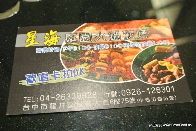 星海碳烤 地址:台中市龍井區台灣大道六段75號 (中港路203號) 電話:(04)2633-0028、0926-126-301 營業時間:週一至週日 18:00~01:00